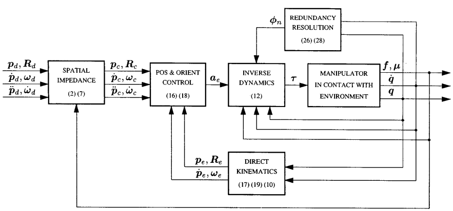 阻抗控制系统由内部的力闭环控制和外部的阻抗计算(位置控制)环节组成。具体而言,它涉及到机器人末端执行器的位置和接触力之间的动态关系,通过调整阻抗参数(如质量、阻尼、刚度)来实现顺应控制。