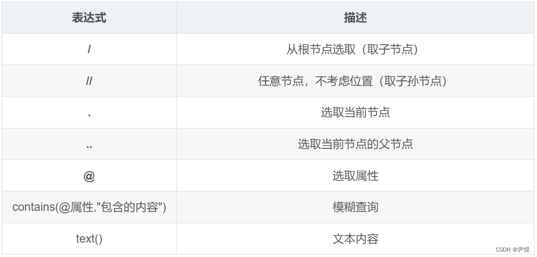 xpath 使用路径表达式在 HTML/XML 文档中选取节点。节点是通过沿着路径或者 step 来选取的。 下面列出了最有用的路径表达式: