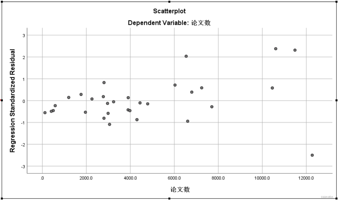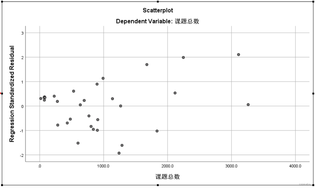 标准化残差的散点图:由图可知,标准化残差落入(-2 — 3)内,有异常值。故满足正态分布前提。标准化残差有随着因变量的增大表现出明显趋势。故满足独立前提。