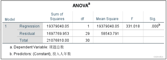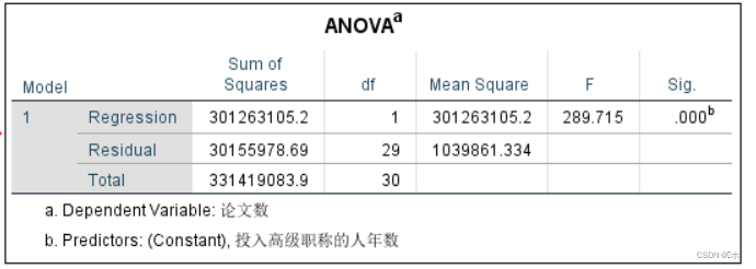 在Anova表可以看F检验:F值=289.715, p值=0.000,p值 <α=0.05,所以可以建立回归方程。