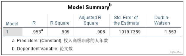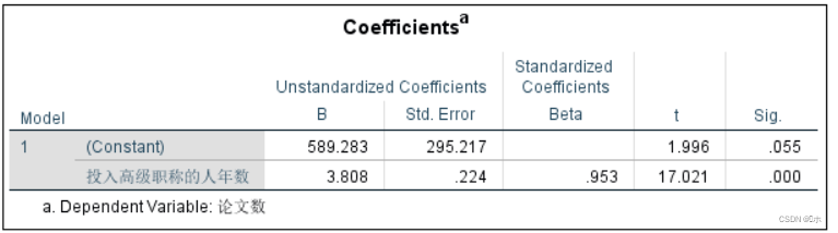选择工具栏[Analyze]→[Regression]→[Linear Regression]。将‘论文数’添加到Dependent中,‘投入高级职称的人数’添加到Independent中。确定输出结果: