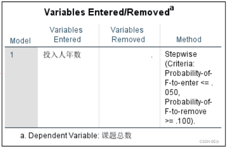 输入/除去的变量表。说明最终进入模型中的变量是投入人年数。