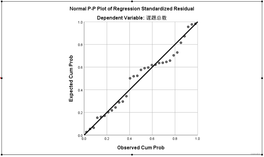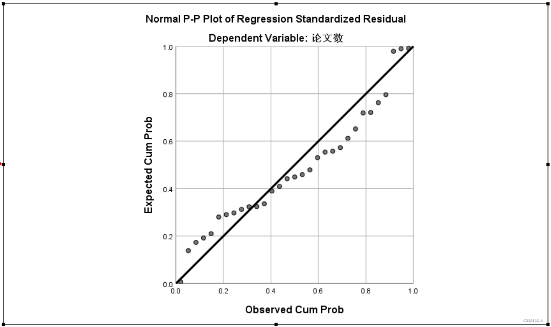 标准化残差的P-P图:由图可知,标准化残差大部分围绕在对角线附近,所以标准化残差近似服从正态分布。