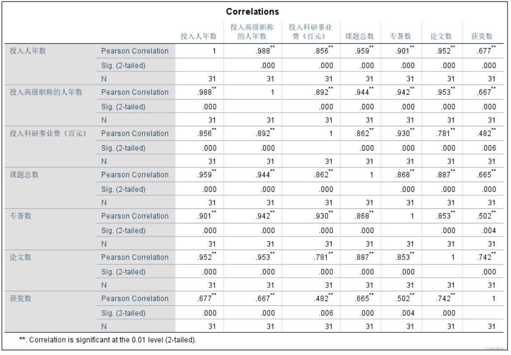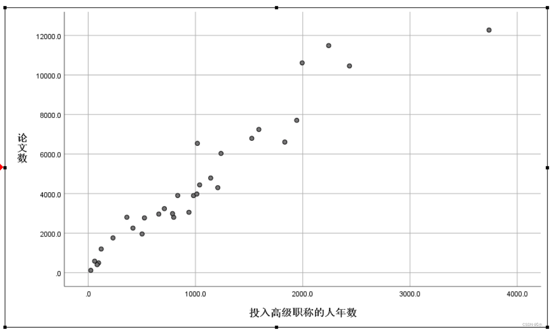 因为投入高级职称的人年数与论文数的Pearson相关系数最大,故二者之间的相关性较强,所以选择投入高级职称的人年数作为自变量,论文数为因变量。