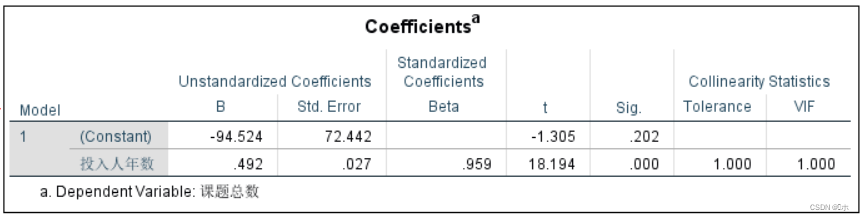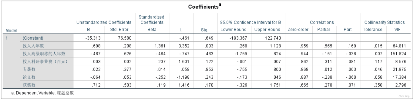结论: 投入人年数、投入高级职称的人年数、专著数、论文数这四个指标的容忍度均<0.1,方差膨胀因子VIF均>10。说明解释变量间有严重的多重共线性。其中投入人年数的P值为0.003<0.05,说明投入人年数对课题总数的影响比较显著。