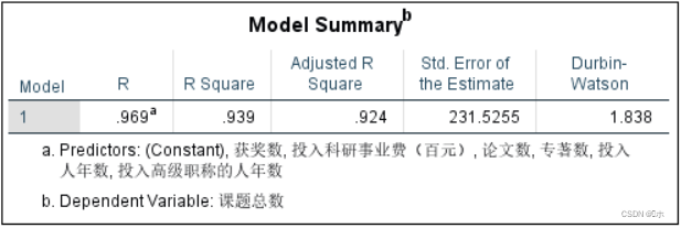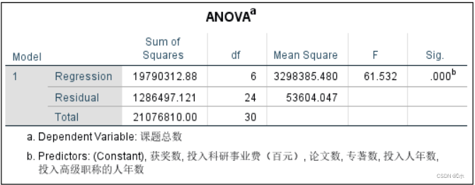 输入/除去的变量表。说明最终进入模型中的变量是哪些:获奖数、投入科研事业费、论文数、专著数、投入人年数、投入高级职称的人年数。