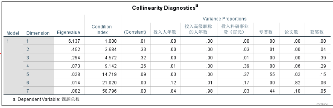 结论:在特征根中,最大特征根的值远远大于其他特征根的值(0.7以上),说明变量间有很强的多重共线性。其中,维度为7的的特征根可以同时刻画投入人年数、投入高级职称的人年数、投入科研事业费、专著数、论文数、获奖数,六个解释变量的方差的较大部分比例,说明这些解释变量间有较强的多重共线性。