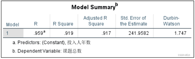 模型摘要表中看r检验:样本相关系数r=0.969,样本决定系数r²=0.939,样本校正决定系数调整后r²=0.924,DW值= 1.838,所以存在正自相关性。 即回归的拟合优度较好。