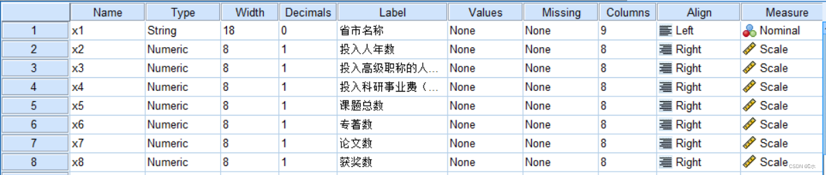 变量视图可以看到该数据集有8个字段,字段名分别为:x1,x2,x3,x4,x5,x6,x7,x8。对每个字段的标签分别为‘省市名称’、‘投入人年数’、‘投入高级职称的人数’、‘投入科研事业费(百元)’、‘课题总数’、‘专著数’、‘论文数’、‘获奖数’。