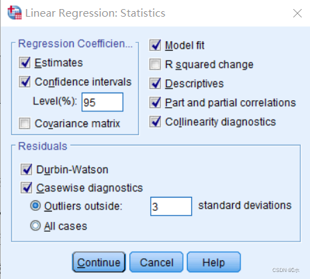 (4)残差分析,即分析残差是否满足“正态、独立、等方差(无异常值)”的前提。在SPSS中,在【分析】--【回归】--【线性】--【绘图】框中,可通过绘制残差的散点图、频率直方图以及正态概率图(P-P图)来完成残差分析。