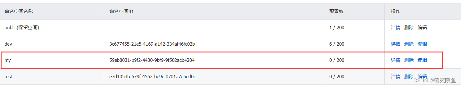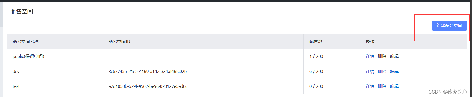 命名空间用于隔离不同的配置环境,例如生产环境,测试环境和开发环境,这是因为不同的环境可能会有不同的配置,或是不同的用户。但是不同的命名空间中可以存在相同名称的配置分组。