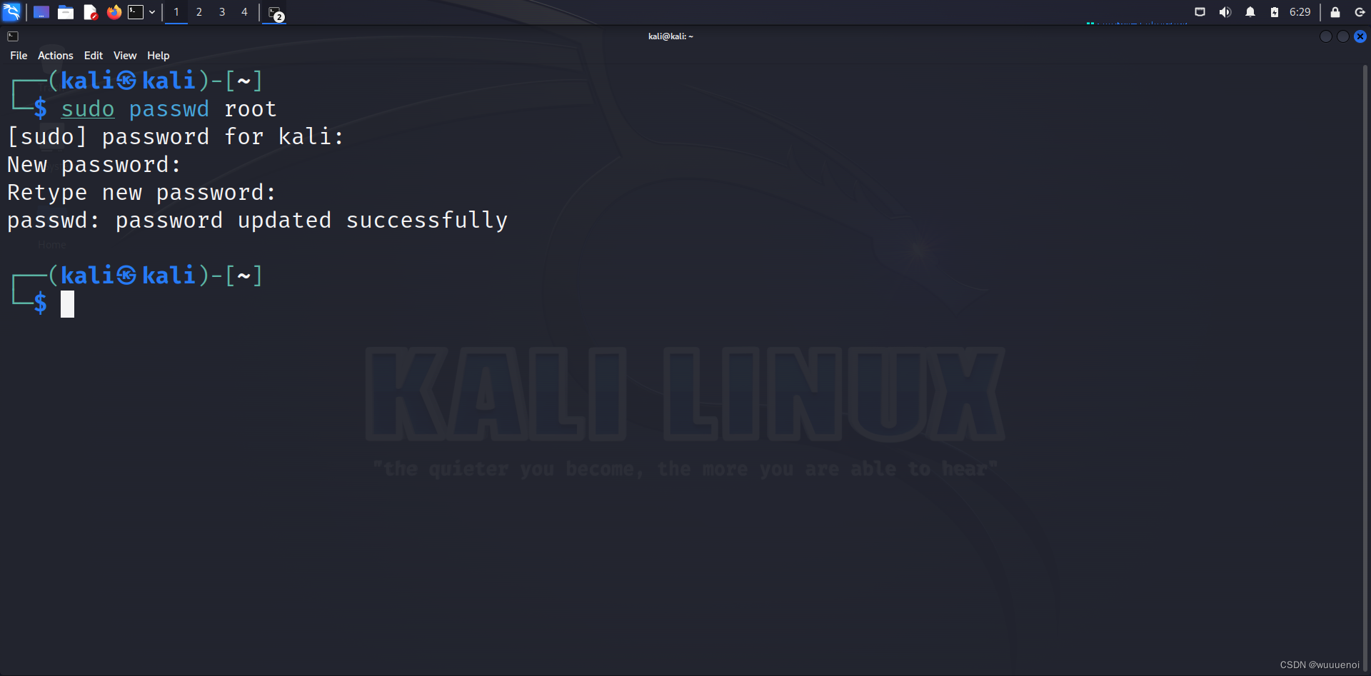初次安装 kali 虚拟机,输入下面命令,提示输入密码,密码一般为默认 "kali",然后就可以设置 root 的密码。