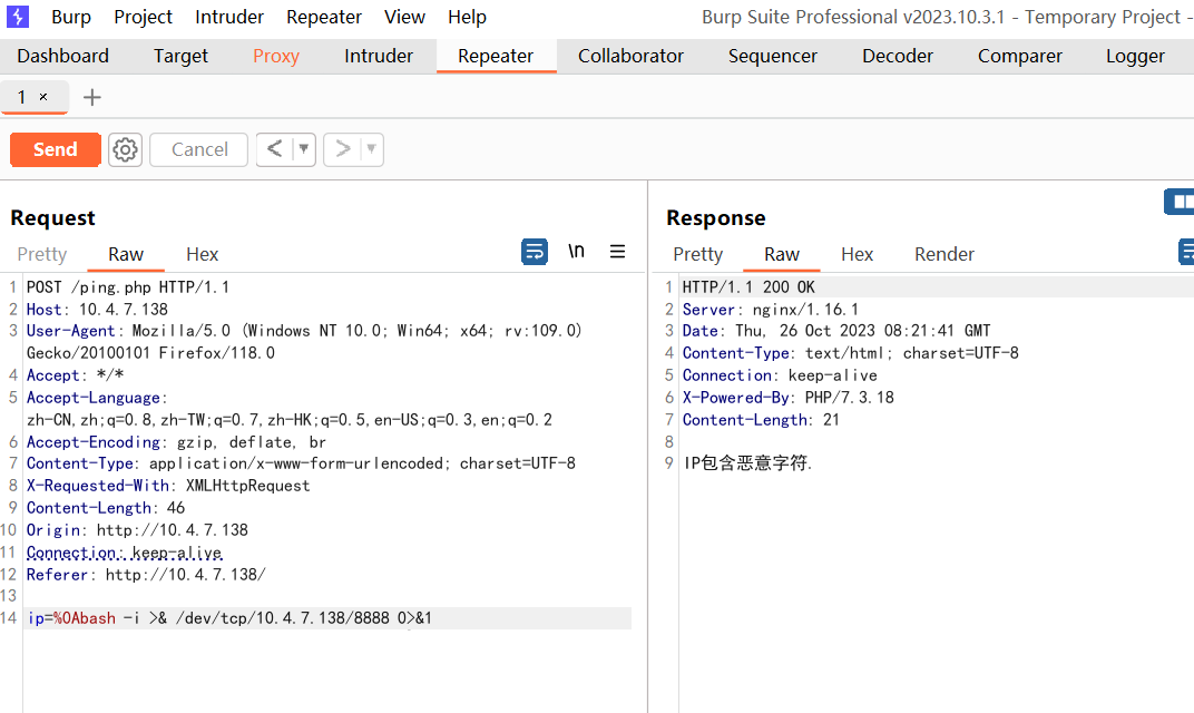 发送到 Repeater 模块中查看,执行成功但并没有回显