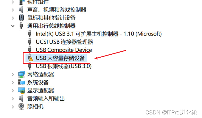 今天拿到一台笔记本,插上U盘没有反应,进【设备管理器】发现【USB大容量存储设备】有个黄色的叹号。