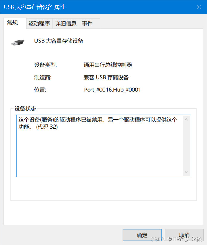 鼠标右键【USB大容量存储设备】打开属性查看信息,显示设状态“这个设备(服务)的驱动程序已被禁用。另一个驱动程序可以提供这个功能。(代码32)”