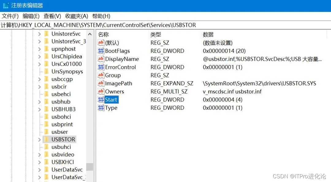 同样的,假如需要禁用某台电脑使用U盘或者移动硬盘等存储设备,可以通过修改注册表计算机\HKEY_LOCAL_MACHINE\SYSTEM\CurrentControlSet\Services\USBSTOR中的Start的值为4,来禁用USB存储设备。