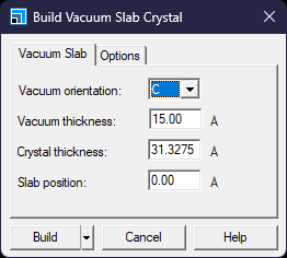 选择 Build → Crystals → Build Vacuum Slab 打开添加真空层界面,选择合适的真空层厚度(Vacuum thickness),点击Build后slab模型建立完毕