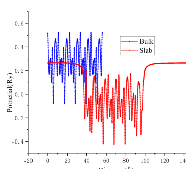 - 为了让slab模型的内部静电势和bulk模型一致,需要在添加真空层的方向将体系扩胞,以创造脱离了表面态影响的内部区域。