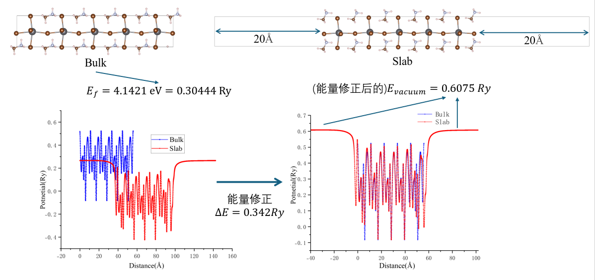 但是在slab计算中,由于表面态的存在,费米能级不准确;而slab内的平均势能和真空平均势能是准确的。
