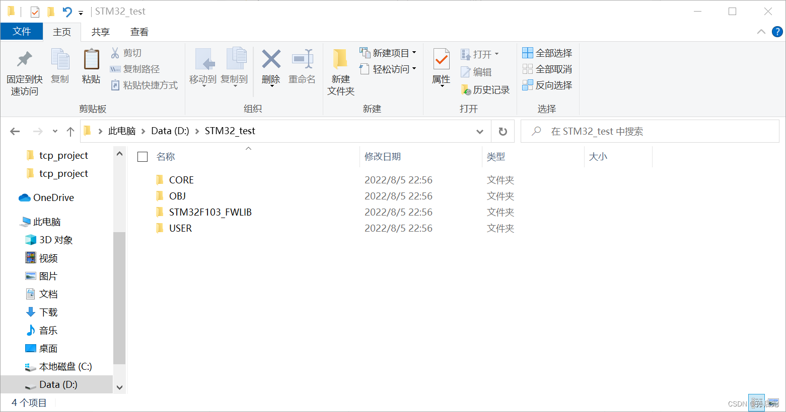 在该文件夹下新建4个文件夹,分别名为USER,CORE,STM32F103_FWLIB,OBJ