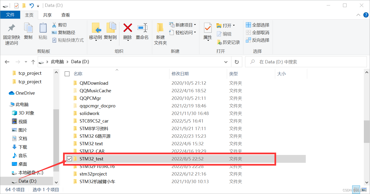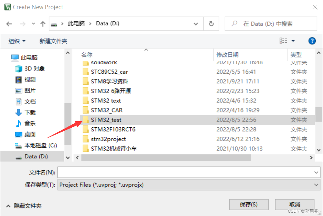 首先要在电脑上新建一个空文档,该文档不能存在中文目录,否则会出现一连串的错误,这里我在D盘新建了一个名为STM32_test的文件夹