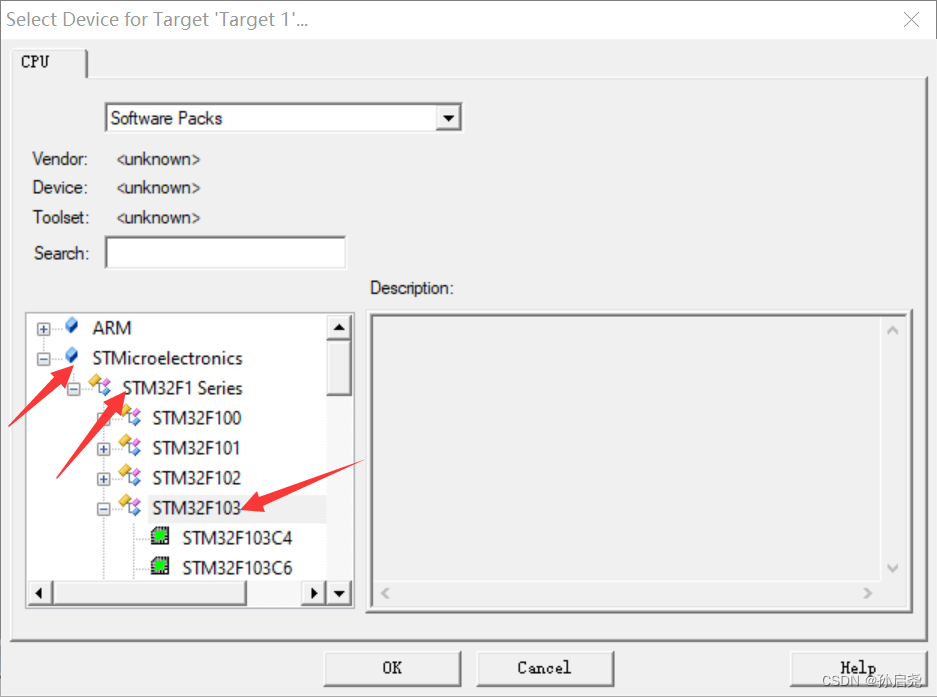之后,在我们的Keil5界面就会弹出一个新的界面,在这个界面下,我们要选择芯片的型号,这里我们选择的STM32F103RCT6