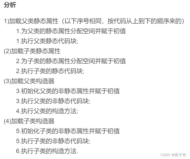 当加载一个类时,先进行静态属性初始化,并为静态属性分配内存空间,静态方法的声明,静态块的加载,没有优先级之分,按出现顺序执行,静态部分仅仅加载一次。至此为止,必要的类都已经加载完毕,在执行main方法!!! 然后再进行普通对象的创建。