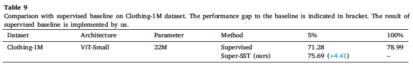 Clothing-1M \citep{xiao2015learning} 是一个大规模数据集,包含约 100 万张从在线购物网站收集的服装图像。该数据集同时表现出严重的类别不平衡和标签噪声,使其成为对鲁棒学习算法特别具有挑战性的基准。类别分布高度倾斜,一些常见的服装类别(如 T 恤、夹克)数量过多,而其他类别(如泳衣、围巾)的样本则少得多。这种不平衡性,加上带噪声的标注,增加了模型训练的难度,因为标准学习方法可能会偏向高频类别,并且难以泛化到代表性不足的类别。我们从干净标注的训练图像中随机抽取 5% 的样本,剩余图像与 100 万带噪声样本合并作为未标注数据。如表9所示,Super-SST 仅使用 5% 的 Clothing-1M 干净标注数据就达到了 75.69% 的 top-1 准确率,比监督基线高出 4.41%,并表现出对类别不平衡和标签噪声的强大鲁棒性。值得注意的是,尽管依赖的标注样本少得多,这一性能已接近 78.99% 的全监督上限,进一步突显了其在现实世界不平衡场景中的有效性。