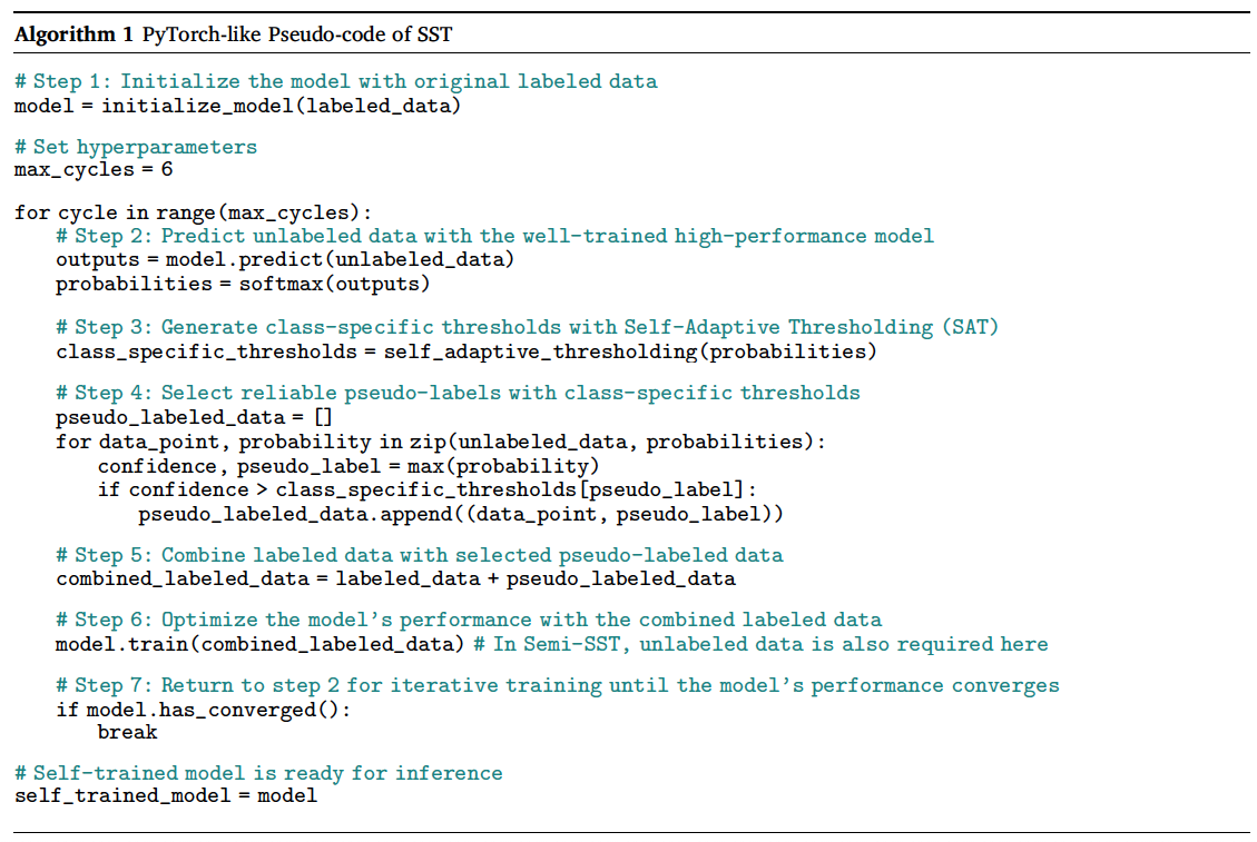 Super-SST 的流程如图1所示,包括以下几个步骤:1) 使用原始标注数据初始化模型。2) 利用训练良好、性能高的模型预测未标注数据。3) 应用自适应阈值(SAT)来准确生成或调整类别特定的阈值。4) 使用类别特定的阈值选择高置信度且可靠的伪标签,减少不准确的伪标签并减轻确认偏差。5) 通过将原始标注数据与精心挑选的伪标签数据相结合来扩展标注训练集,并同等对待它们。6) 使用合并后的标注数据优化模型性能。7) 返回步骤 2 进行迭代训练,在多个周期内不断改进模型,直到其性能收敛。