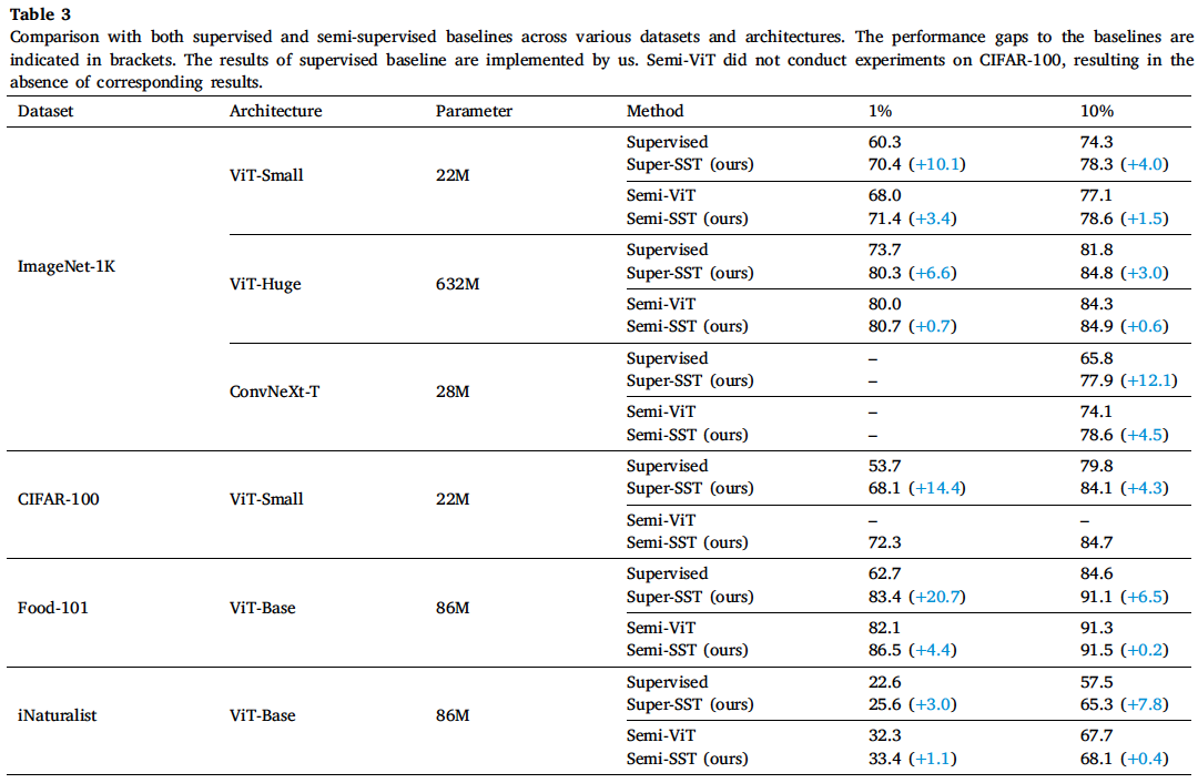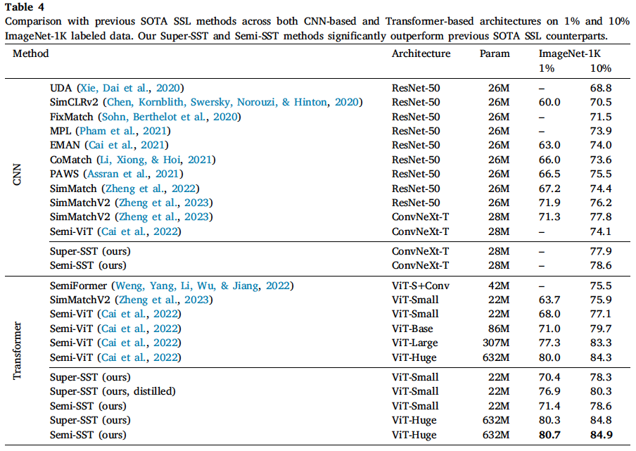 \textbf{可扩展性}. 如表3所示,Super-SST 和 Semi-SST 在使用像 ViT-Huge 这样更大的架构时均显示出显著的改进,表明随着模型容量的增加具有更好的可扩展性。例如,在 1% / 10% 的 ImageNet-1K 标注数据和 ViT-Huge 架构下,Super-SST 相对于监督基线显示出 6.6% / 3.0% 的相对提升,而 Semi-SST 相对于半监督基线显示出 0.7% / 0.6% 的相对提升。