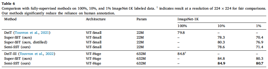 表6将我们的 SST 方法与全监督方法(如 DeiT \citep{touvron2021training} 和 DeiT-III \citep{touvron2022deit})在 ImageNet-1K 上进行了比较。如图所示,全监督的 DeiT-III-ViT-Huge 模型使用 100% 的标注数据达到了 84.8% 的 Top-1 准确率。相比之下,即使标注数据显著减少,我们的方法表现也异常出色。例如,仅使用 10% 的标注数据和 ViT-Huge,Super-SST 和 Semi-SST 分别达到了相同(84.8%)和更高(84.9%)的 Top-1 准确率,这意味着人力标注成本降低了十倍,并突显了我们方法在利用未标注数据方面的有效性。这表明我们的方法在获取标注数据具有挑战性或成本高昂的应用中可以非常有效,从而显著缩小了半监督方法与全监督方法之间的性能差距。此外,使用从大到小的蒸馏技术,Super-SST-ViT-Small 在 10% 标注数据上达到了令人印象深刻的 80.3% Top-1 准确率,超过了全监督 DeiT-ViT-Small 在 100% 标注数据上 79.8% 的 Top-1 准确率。