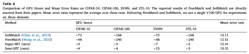 \textbf{GPU 小时的比较}. 表8提供了 FreeMatch、SoftMatch、Super-SST 和 Semi-SST 在多个基准数据集(包括 CIFAR-10、CIFAR-100、SVHN 和 STL-10)上的计算效率和平均错误率的全面比较。在计算平均错误率时,我们复用了表5中的实验结果。需要注意的是,与我们的研究以及 SimMatchV2 和 USB 相比,FreeMatch 和 SoftMatch 采用了一套略有不同的基准配置。具体来说,FreeMatch 报告了 CIFAR-10(10 个标签)的结果,但没有提供 STL-10(250 个标签)的结果。同时,SoftMatch 没有报告 SVHN 和 STL-10(250 个标签)的结果。为了与 USB 和 SimMatchV2 保持一致,我们的研究排除了 CIFAR-10(10 个标签),但包含了 SVHN 和 STL-10(250 个标签)。为确保公平一致的比较,我们考虑了这些基准配置的交集,最终包含了 10 种设置:CIFAR-10(含 40、250 和 4000 个标签)、CIFAR-100(含 400、2500 和 10000 个标签)、SVHN(含 40 和 1000 个标签)以及 STL-10(含 40 和 1000 个标签)。如表 8所示,Super-SST 和 Semi-SST 在保持优越性能的同时显著降低了计算成本。在 CIFAR-100 上,FreeMatch 需要大约 240 GPU 小时,而 Super-SST 和 Semi-SST 分别以约 3 和 4 GPU 小时取得了更好的性能,速度分别提升了 80 倍和 60 倍。类似地,在 STL-10 上,FreeMatch 消耗约 240 GPU 小时,而 Super-SST 和 Semi-SST 分别需要约 2 和 3 GPU 小时,将计算成本降低了 120 倍和 80 倍。在 CIFAR-10 和 SVHN 上也观察到了类似的趋势,Super-SST 和 Semi-SST 所需的 GPU 小时始终比 FreeMatch 和 SoftMatch 少一个数量级。除了效率之外,Semi-SST 取得了最佳的整体性能,平均错误率达到 10.31,低于 SoftMatch(13.11)、FreeMatch(12.51)和 Super-SST(12.41)。值得注意的是,这种改进是在 GPU 小时数大幅减少的情况下实现的,进一步证明了我们的方法在减轻确认偏差的同时保持轻量级计算足迹的有效性。结果突显了我们提出的 SST 方法的效率和有效性。通过显著减少训练时间同时保持或超越最先进的性能,我们的方法为现有的半监督学习方法提供了一个引人注目的替代方案。这些发现强调了 SST 作为一种极具成本效益的解决方案在大规模 SSL 应用中的潜力,尤其是在计算资源受限的场景中。请注意,我们使用了 ViT-Small 架构,而 FreeMatch 和 SoftMatch 采用了 Wide ResNet (WRN) 架构 \citep{zagoruyko2016wide},这可能导致比较不那么直接。