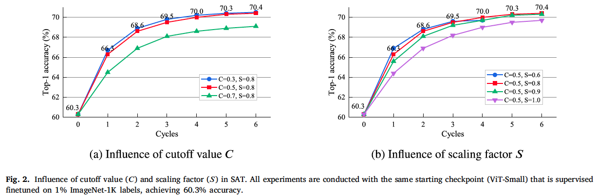 图2探讨了不同截断值 $C$ 和缩放因子 $S$ 对多个训练周期内 Top-1 准确率的影响。每个子图关注一个特定变量,同时保持另一个变量不变,以观察它们的个体效应对性能的影响。所有实验均使用相同的起始检查点(即 ViT-Small)进行,该检查点在 1% ImageNet-1K 标注数据上进行了监督微调,达到了 60.3% 的 Top-1 准确率。如图2所示,较低的截断值(C=0.3 和 0.5)导致更快、更高的准确率提升。较高的截断值(C=0.7)性能不如较低的截断值,表明高截断值可能会阻碍模型性能。如图2所示,较低的缩放因子(S=0.6)导致准确率提升更快,但很快稳定在较低水平,表明在多个训练周期内改进不足。较高的缩放因子(S=1.0)导致改进较慢且峰值准确率较低。中等的缩放因子(S=0.8 和 0.9)提供了更好的性能。基于这些观察,我们在 ImageNet-1K 上为 ViT-Small 设置 $C$ 为 0.5, $S$ 为 0.8;为 ViT-Huge 设置 $S$ 为 0.9。