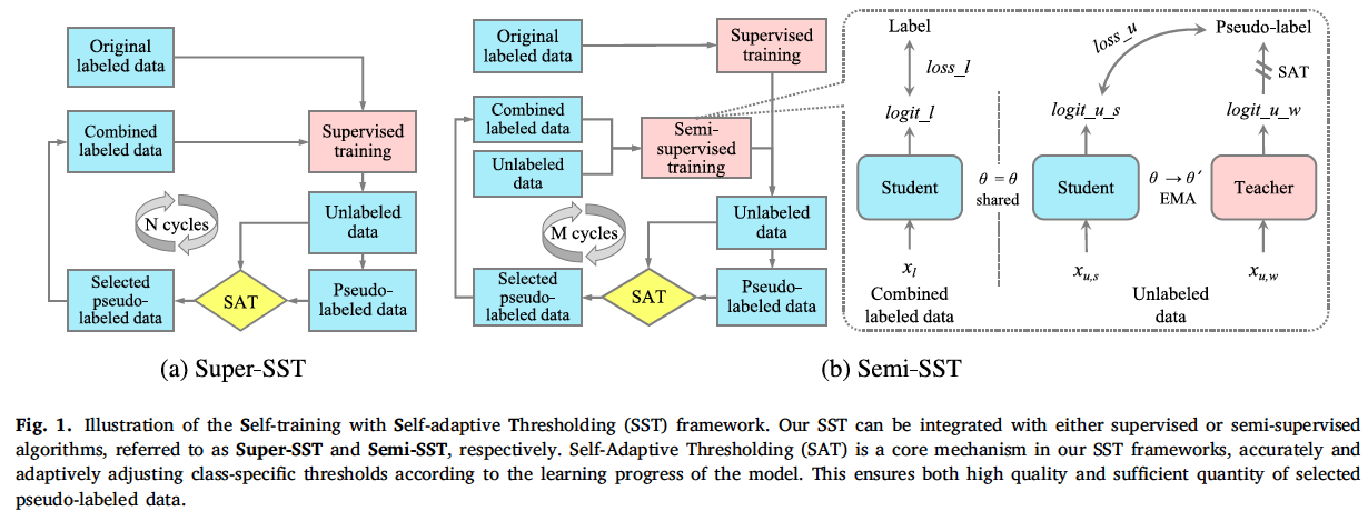 为了解决上述问题,我们提出了一种新颖、有效且高效的 SSL 框架:使用自适应阈值的自训练(Self-training with Self-adaptive Thresholding, SST),该框架显著推动了 SSL 领域的发展。如图1所示,我们的 SST 框架可以与监督或半监督算法相结合。我们将监督训练与 SST 的结合称为 \textit{Super-SST},将半监督训练与 SST 的结合称为 \textit{Semi-SST}。我们的 SST 引入了一种创新的自适应阈值(Self-Adaptive Thresholding, SAT)机制,该机制根据模型的学习进度准确且自适应地调整类别特定的阈值。这种方法确保了所选伪标签数据的高质量和足够数量,减轻了不准确伪标签和确认偏差的风险,从而提升了整体模型性能。