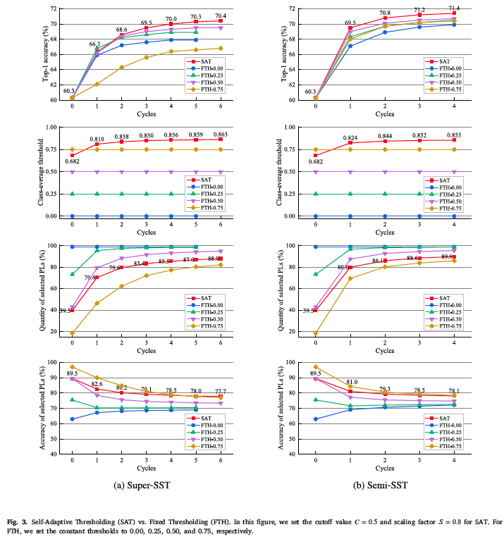 图3展示了自适应阈值(SAT)与各种固定阈值(FTH)设置在 Super-SST 和 Semi-SST 中的全面比较。分析的指标包括 Top-1 准确率、类别平均阈值、以及多个训练周期内筛选出的伪标签(PLs)的数量和准确率。所有实验均使用相同的起始检查点(即 ViT-Small)进行,该检查点在 1% ImageNet-1K 标注数据上进行了监督微调,达到了 60.3% 的 Top-1 准确率。