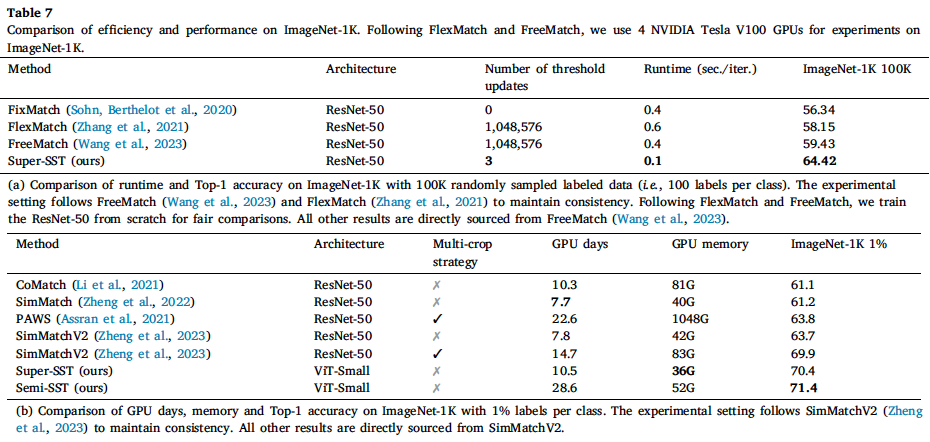 \textbf{阈值更新与运行时间的比较}. 表7提供了 FixMatch、FlexMatch、FreeMatch 和 Super-SST 之间效率和性能的详细比较。请注意,自监督预训练在我们的方法中是可选的。为了公平比较,我们遵循与 FlexMatch 和 FreeMatch 相同的协议,在 10 万 ImageNet-1K 标注数据(即每类 100 个标签)上从头开始训练 ResNet-50。如图所示,FixMatch 使用预定义的恒定阈值,导致零次阈值更新。FlexMatch 和 FreeMatch 都在每次迭代时更新类别特定的阈值,导致超过 1,000,000 次更新,使其计算密集且成本高昂。Super-SST 训练 ResNet-50 共 3 个周期,并且仅在每个训练周期更新一次类别特定阈值,最终仅需 3 次更新。更新次数上的巨大差异使得 Super-SST 在时间和计算成本方面效率高得多。此外,Super-SST 使用训练良好、性能高的模型更新阈值,减少了错误的预测和确认偏差。相比之下,FreeMatch 和 FlexMatch 使用仍在训练中的模型更新阈值,导致在早期阶段产生更多不准确的预测并放大确认偏差,最终导致性能较差。Super-SST 实现了每次迭代 0.1 秒的最快运行时间,而 FixMatch 和 FreeMatch 为 0.4 秒,FlexMatch 为 0.6 秒。这使得 Super-SST 在所比较的方法中成为运行时间更快、阈值更新次数最少的最高效方法。此外,Super-SST 不仅在效率上表现出色,还达到了 64.42% 的最高 Top-1 准确率,显著地大幅超越了所有同类方法。