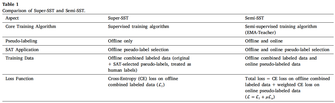 如图1所示,Semi-SST 通过整合 EMA-Teacher 模型 \citep{cai2022semi} 增强了 Super-SST 的离线伪标签流程,引入了动态的在线伪标签来补充离线过程。具体来说,在 EMA-Teacher 中,教师模型在线动态生成伪标签,而学生模型则在离线合并的标注数据和这些在线伪标签数据上进行训练。因此,Semi-SST 同时采用了离线和在线伪标签机制,并在两种情况下都应用 SAT 以确保高置信度伪标签的选择。表1概述了 Super-SST 和 Semi-SST 之间的主要区别。