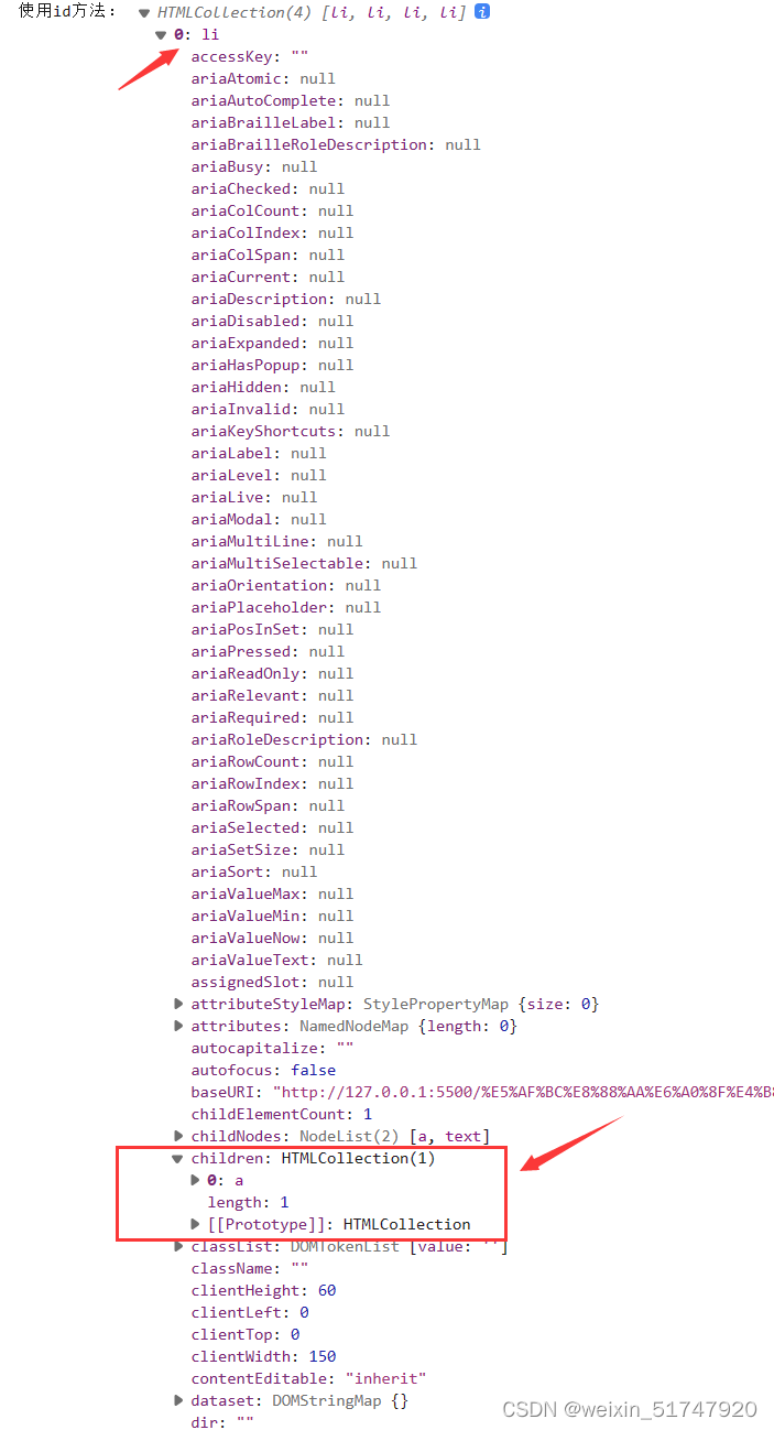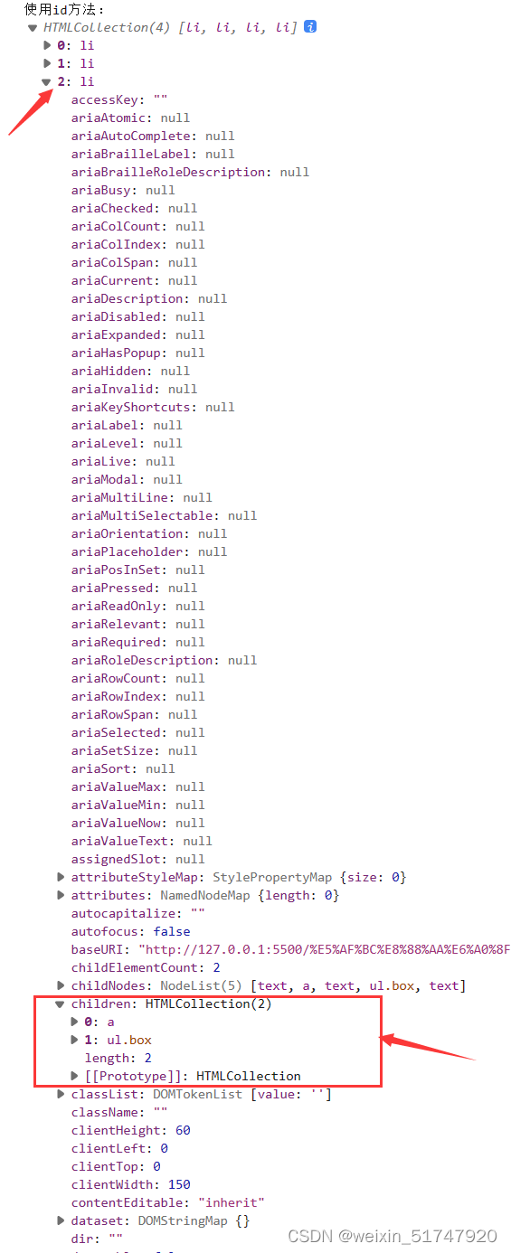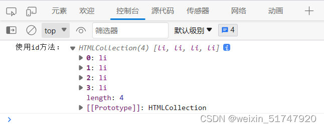 通过控制台我们可以查看id="nav"元素的孩子信息:id="nav"元素共有4个亲孩子,均为li。进一步查看各li的孩子,如下图所示: