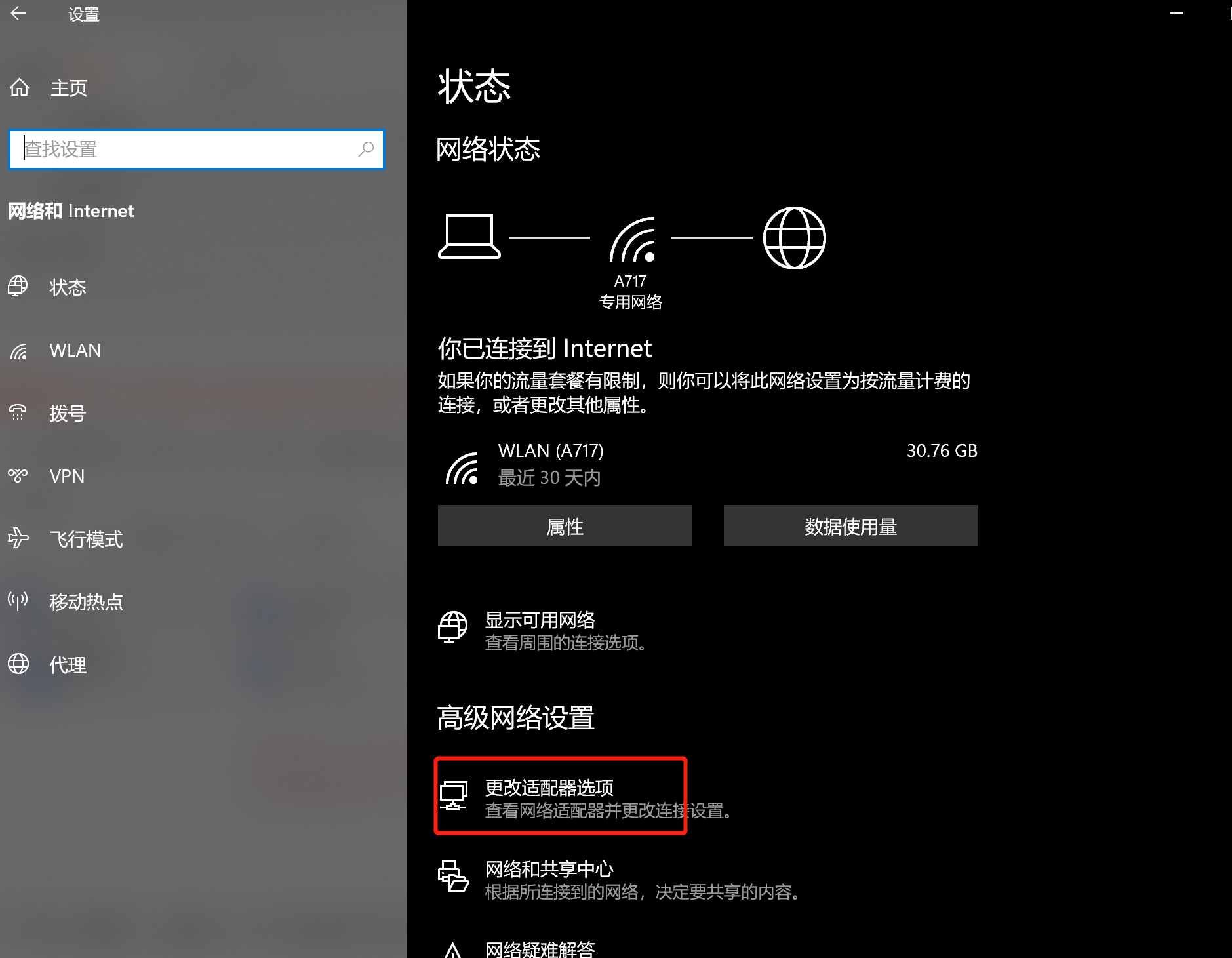 点击”更改适配器选项”