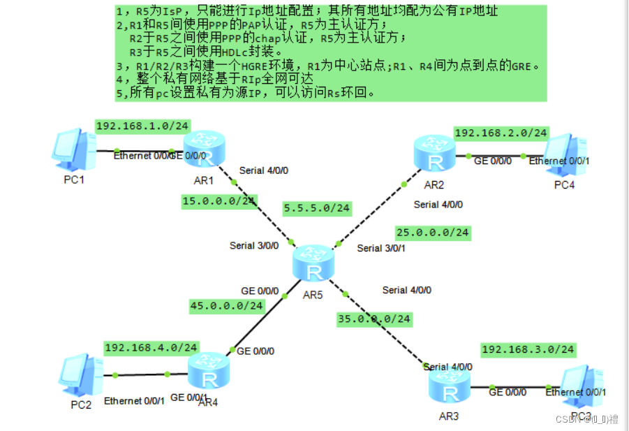 2,R1和R5间使用PPP的PAP认证,R5为主认证方﹔