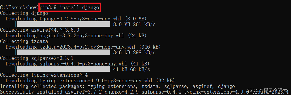 Django开发:(一)如何安装Django 2.进入到创建Django的目录中(如:我是放在D:\codeworkspace\python_Django)D:\Python\Scripts\django-admin.exe startproject 项目名称。2.打开cmd,输入命令pip3.9 install django(以python3.9为例),即可完成。3.成功后python目录下的Scripts文件夹里会有django-admin.exe。4.安装时可能会出现pip版本过低的问题,因此要upgrade,如下所示。出现以上文件表示成功。