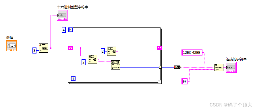 laview实现16进制显示下的字符串连接 如果说有一段16进制数据12E3 42EE (XXXX XXXX) FF,其中XXXX XXXX为用户输入的数值转换为的16进制数,那么我们就要实现16进制显示下的字符串连接。