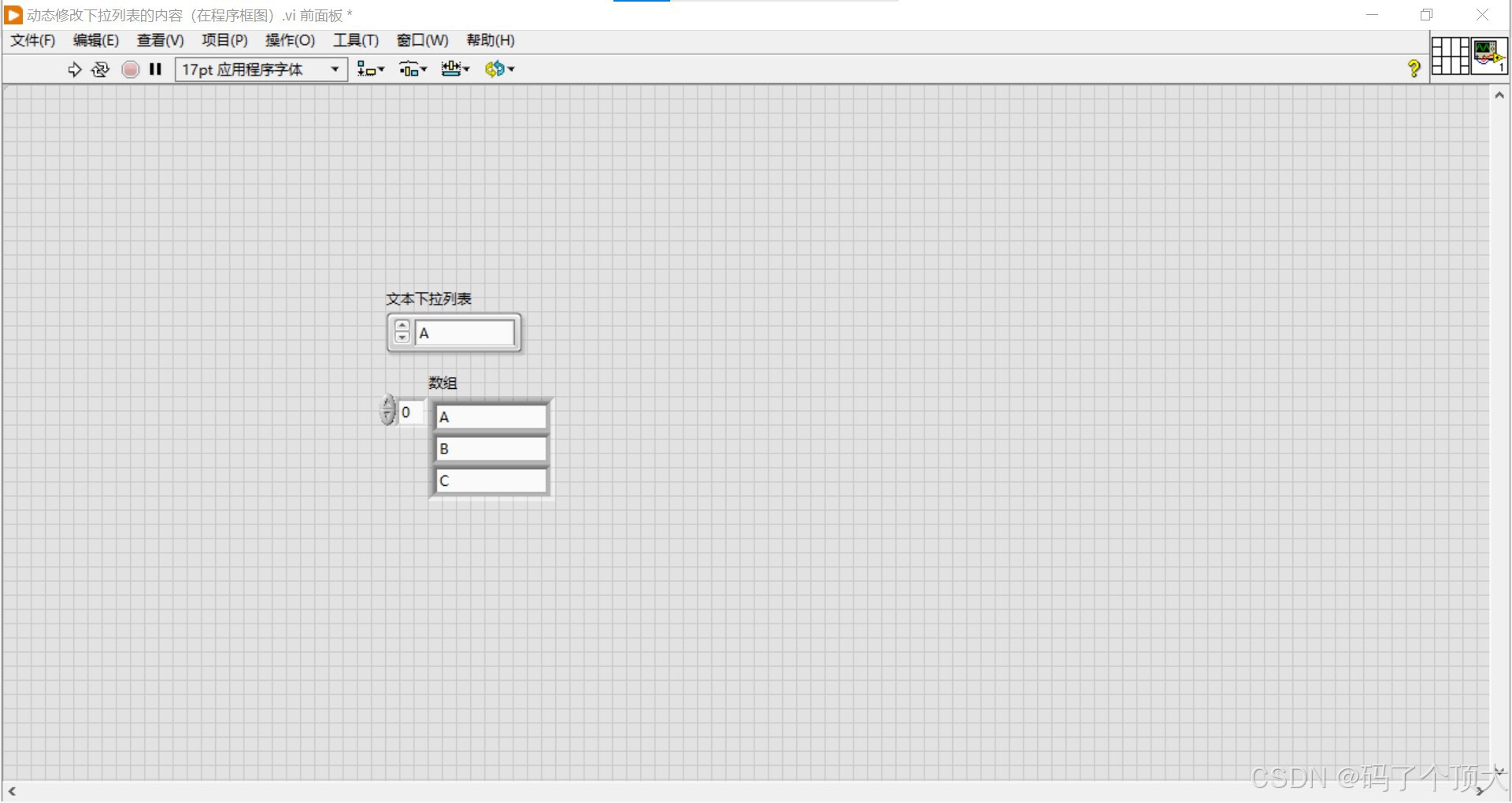 Labview如何动态修改下拉列表的内容(在程序框图) 在前面板创建一个下拉列表和一个数组(以字符型数组为例),并为数组赋值A,B,C。①对下拉列表右键,创建-->属性节点-->字符串[]②对新创建的右键,全部转换为写入。③将数组连向Strings[]在前面板运行即可得到结果。