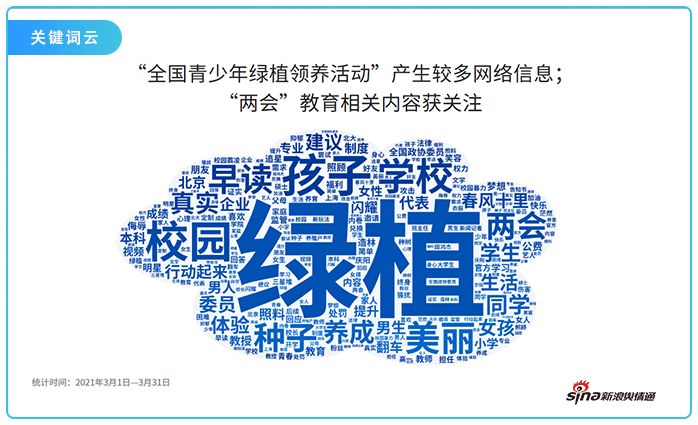 通过关键词云图可见,“绿植”“校园”“种子”“美丽”等成为舆论传播的高频词汇,主要因“美丽中国,青春行动——第十一届全国青少年绿植领养活动”获得了网民的关注,在微博平台产生了大量信息。此外,由“两会”“委员”“代表”“建议”等词可以看出,2021年全国两会期间有关教育行业的发展情况、规划、提案、建议等内容获得了舆论高度关注。