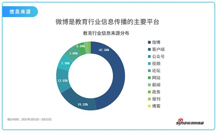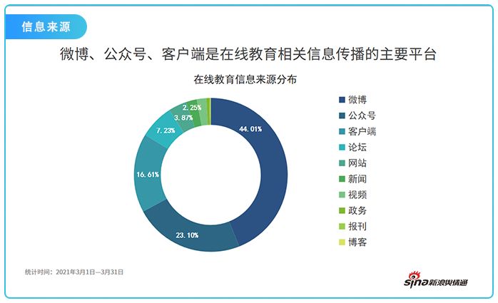 3月份在线教育行业共产生信息508.3万条,全行业比重为3.28%。微博、公众号、客户端是在线教育相关信息传播的主要平台,信息量占比之和超83%。