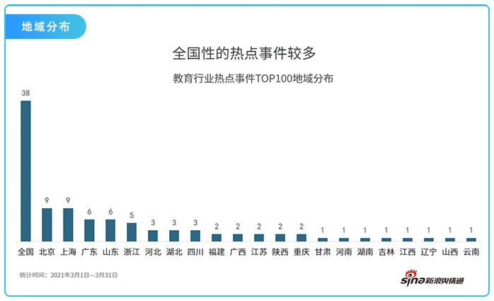 经统计,3月教育行业相关事件达1300余件。对热度指数TOP100的事件(不包含政策)进行地域分布统计可见,全国性教育事件较多,为38件,其中“全国多地中小学开学 部分地区学校开展线上教学”“2021年硕士研究生招生考试国家线公布”等事件获得了舆论较高关注。北京和上海的相关热点事件均为9件,“网民质疑中传招生男女不平等”“上海高中录取新政出炉”等事件热度较高。