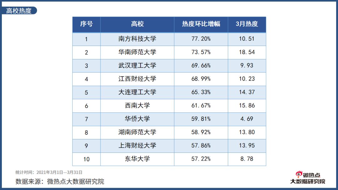 本月教育舆情关注点集中在两会教育提案、全国两会期间的教育相关内容、校外培训乱象、招生考试事件、在线教育明星教师事件及绿植领养活动。热度增幅榜单显示南方科技大学和华南师范大学关注度提升明显。