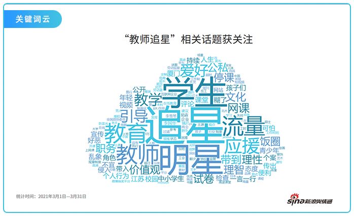 通过关键词云图可见,舆论对在线教育行业的关注点较为集中。其中“追星”“明星”“应援”“流量”“饭圈”等成为传播核心词汇,主要因“教师追星”现象获得舆论热议,如@搜狐新闻 发布了评论微博“作文题是吹捧流量明星,试卷怎么成了老师们追星的手段?”提到了“厦门某中学老师网课宣传流量明星被停课”“银川一老师网课中疑因网名辱骂学生”等事件。该条微博的转发量超100万次、评论量2.54万条、271.43万个点赞。