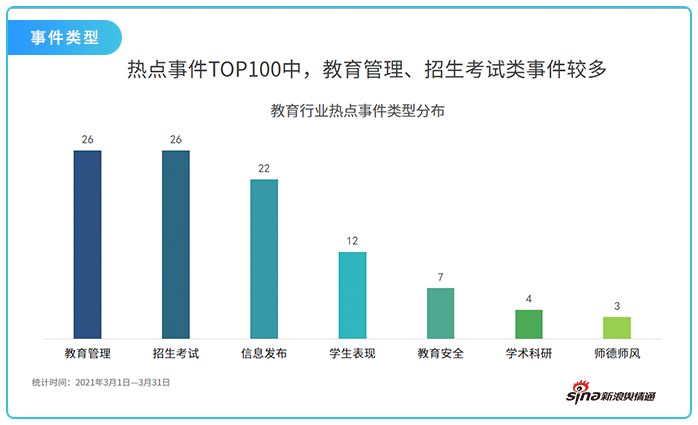 对教育行业热点事件TOP100(不包含政策)进行类别划分可见,“教育管理”“招生考试”类事件较多,均为26件,“全国多地中小学开学 部分地区学校开展线上教学”“2021年硕士研究生招生考试国家线公布”等事件的热度较高。“信息发布”类事件共22件,“2021年高校毕业生909万创历史新高”“2021年QS世界大学学科排名发布”等事件热度较高。此外,“学生表现”类事件也引发较多关注。