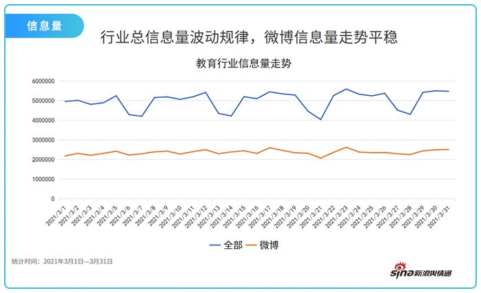 从全网信息量走势图可以看出,3月份教育行业信息量总体波动较为规律,微博信息量走势更为平稳。部分校园活动、招生考试等方面信息获得舆论的较高关注,促使行业信息量升高,日信息量保持在400万条以上。